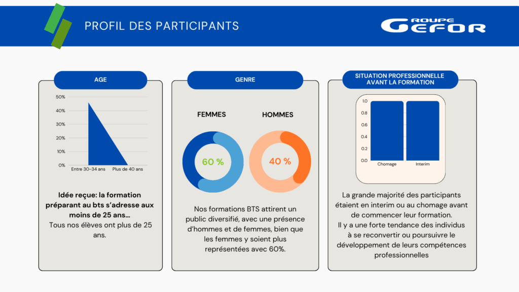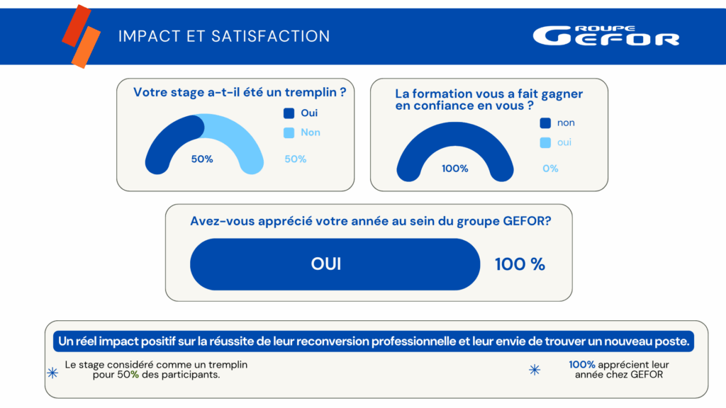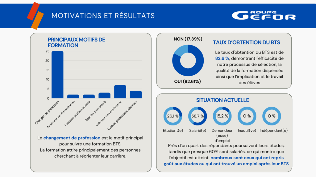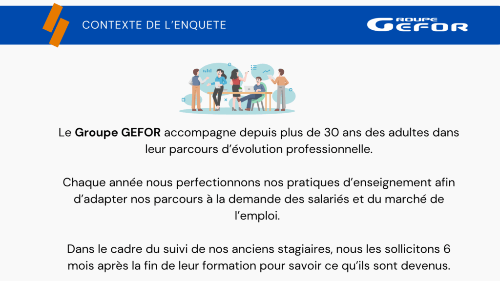 Soucieux du devenir de ses anciens stagiaires, tous les ans, le Groupe GEFOR  les sollicite environ 6 mois après la fin de leur formation,  afin de savoir ce qu’ils sont devenus et mesurer ainsi l’impact de la formation sur la réussite de leur projet professionnel.